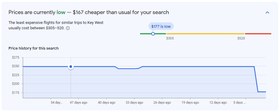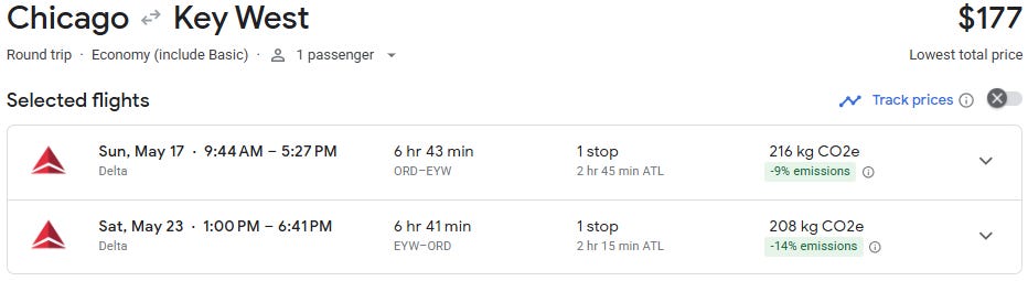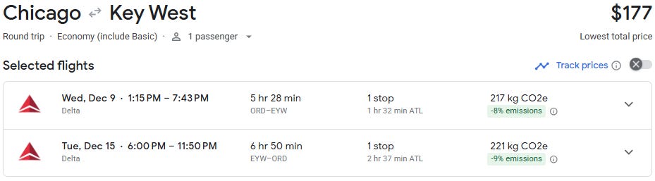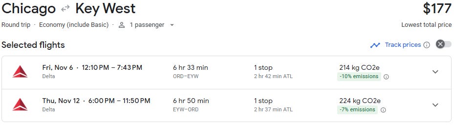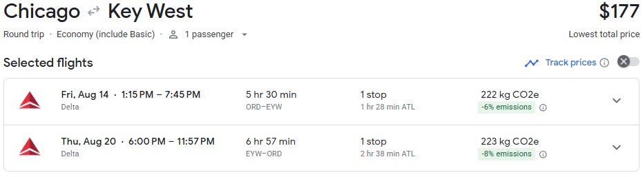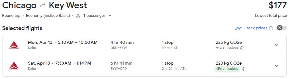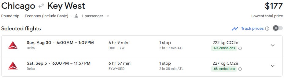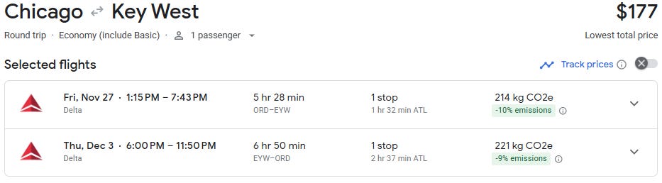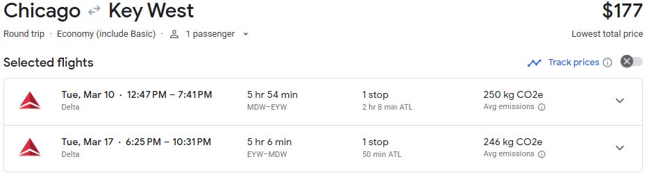 Delta has roundtrip flights from Chicago to Key West priced at just $177 for travel March through May, and then again August through December. That’s an incredible fare for a route that almost never dips this low — the only time I’ve seen it cheaper was back in May of 2023, when it briefly hit $175.