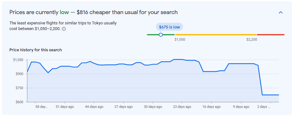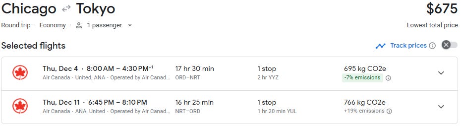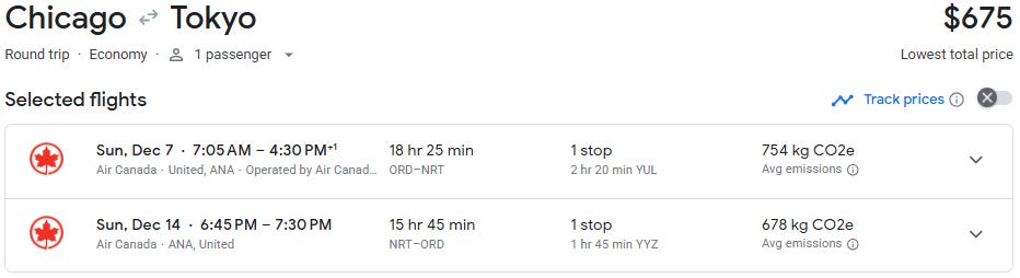 This one honestly surprised me. There are very limited flights from Chicago to Tokyo for $675 roundtrip on Air Canada for travel in December. For context, this route is usually $1,200+, and it’s not uncommon to see it push even higher during the winter.