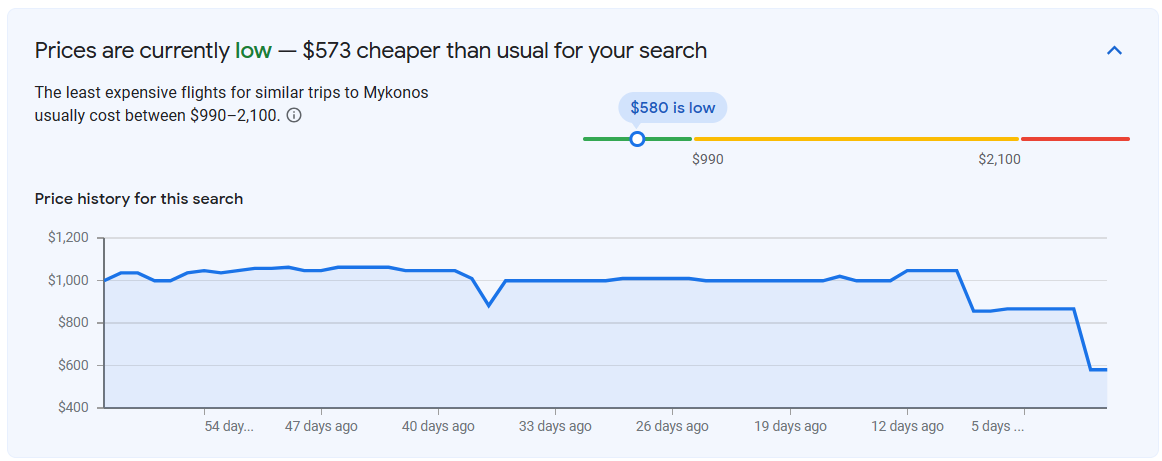 Here is a fantastic flight option from Detroit-to-Mykonos, Greece at $580 for travel in October! This flight has averaged $1,054 from Detroit and this flight doesn’t get much cheaper from Chicago where this route has averaged $920! This flight does require an overnight layover in London, but there are several hotels near the airport and several located in the terminals.