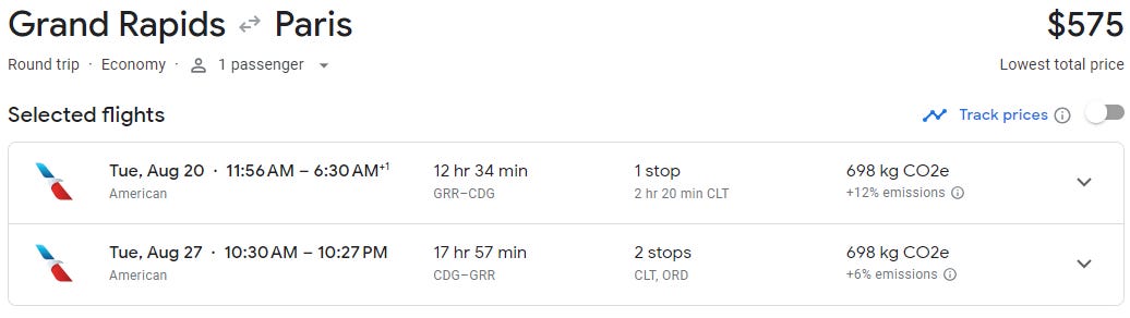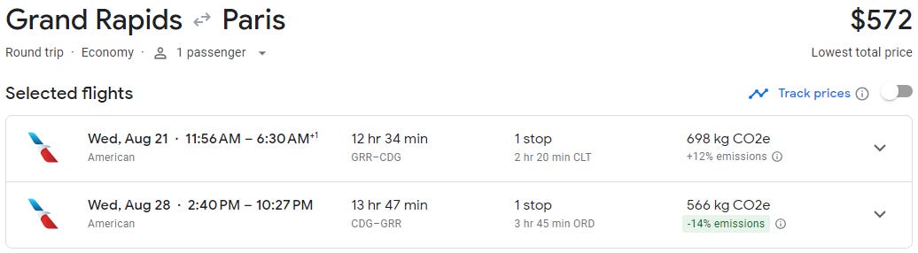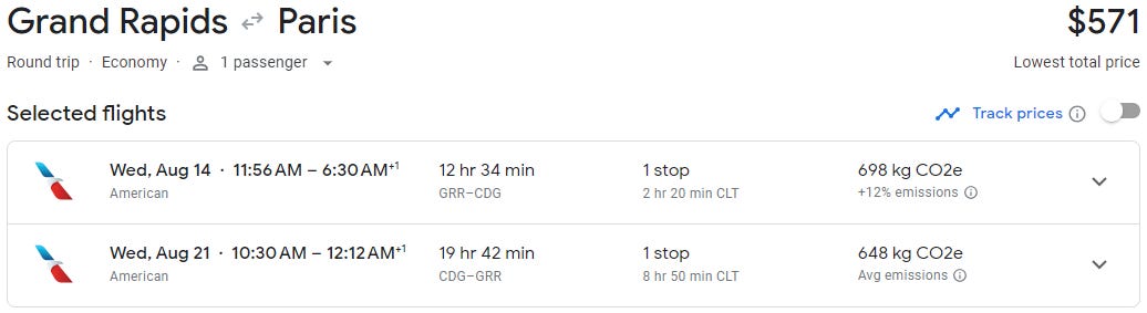 Here's a flight deal you don’t want to miss: Grand Rapids to Paris this summer for only $571! Normally, prices like these are for winter travel, but we're talking about August here! A flight to Paris with American Airlines at this price is a exceptional find, especially when it's usually between $900 and $1000. Act fast and book now! 🛫🗼🌞