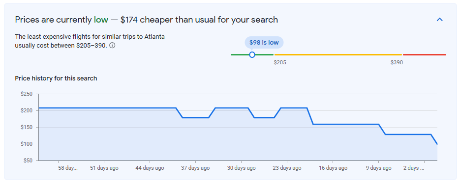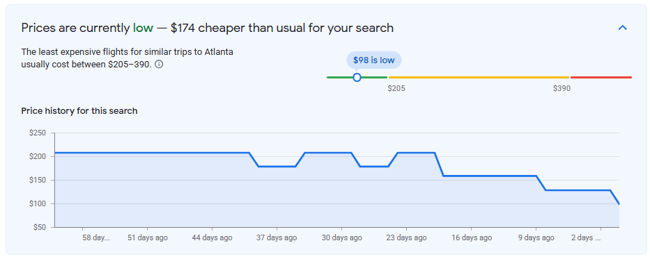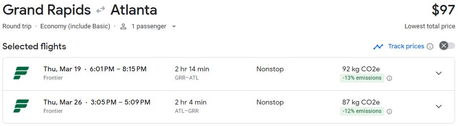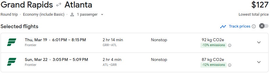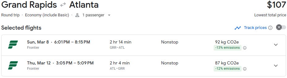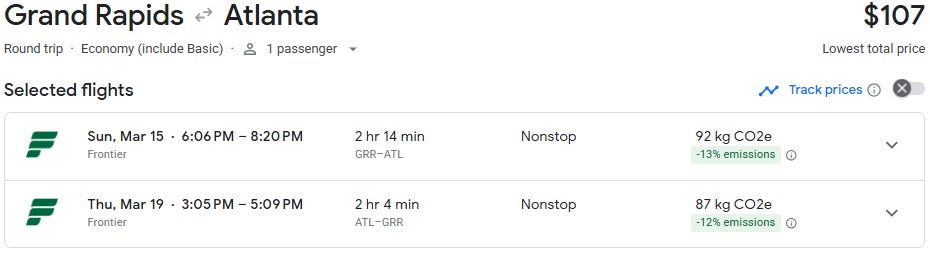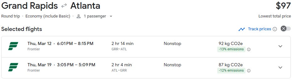If you’ve been eyeing a quick spring getaway, this one is worth a look. Direct flights from Grand Rapids to Atlanta are currently available starting at just $98 roundtrip for travel in March, which is well below the historical average on this route of $250+. At this price point, it’s an easy long weekend escape or a warm-weather reset before spring fully arrives in Michigan.