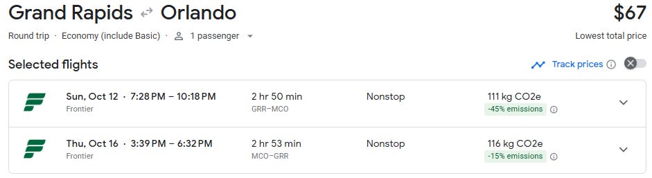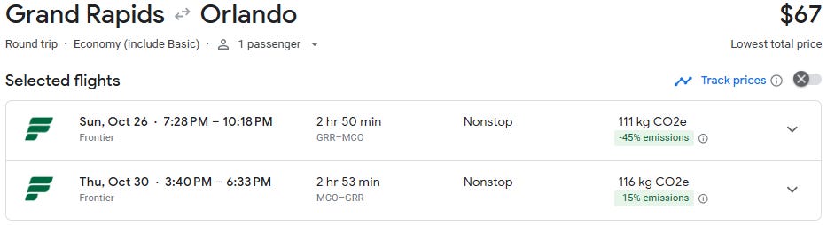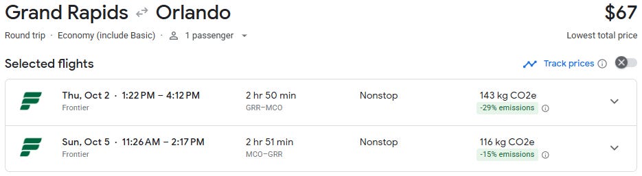 Frontier Airlines is making it easier than ever to escape the Michigan chill this fall — with direct flights from Grand Rapids (GRR) to Orlando (MCO) for just $67 round trip. Yes, you read that right — less than dinner and a movie for two, and you’re in sunny Florida!