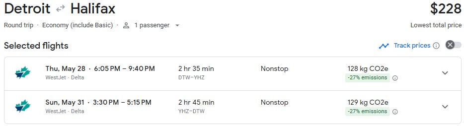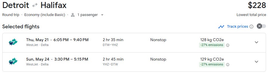 Here’s a gem for those looking for an early summer escape: direct flights from Detroit to Halifax, Nova Scotia are now just $262 round trip for travel in May and June. These flights are usually priced at $500+, and this is the lowest price I’ve seen on this route. The prior low was back in July at $282.