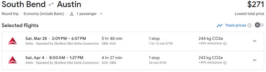 If you’ve been waiting for a warm, easy spring break destination from South Bend, Austin is tough to beat at this price.