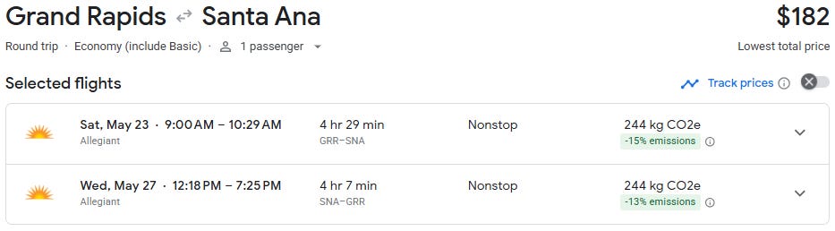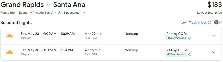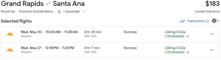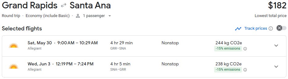 Historically, flying from Grand Rapids to Orange County has required a connection and routinely averaged $350+ roundtrip. With Allegiant entering the market, flights for travel beginning in May are now available from just $187 — a price point that’s genuinely rare on a long westbound route like this.