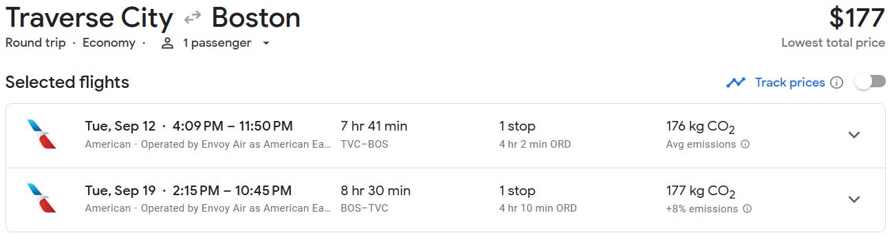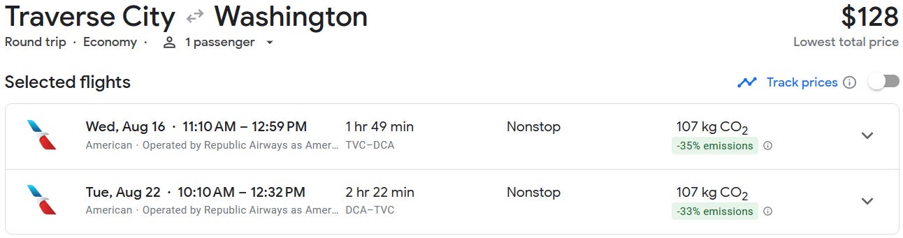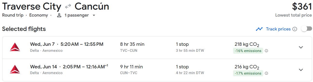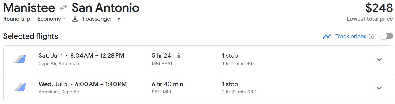 Here are a couple outstanding flights from Northern Michigan! I was excited to find the flights to Austin and San Antonio from Manistee, which are shown below. There is also a direct flight to D.C. from Traverse City at $128, a flight to Cancun at $361, and a flight to Boston at $177!