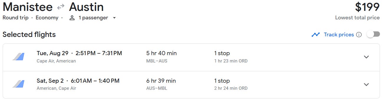 There are Manistee to Austin flights available in the low 200’s June - August!