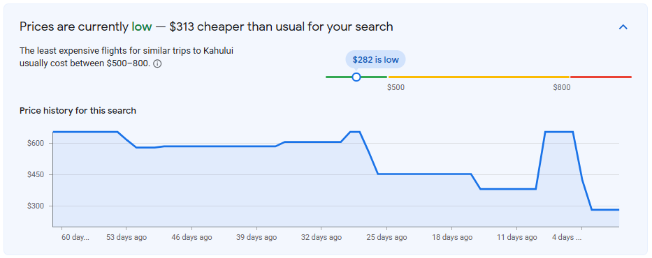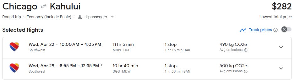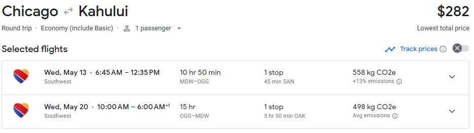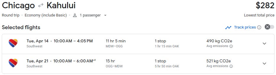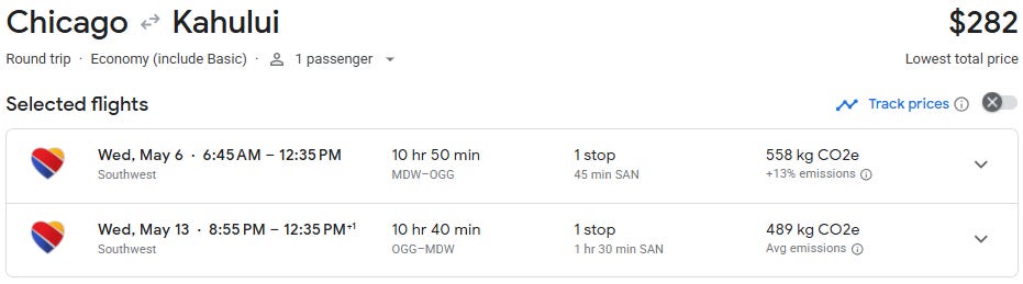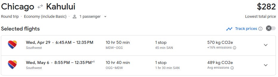 Southwest just dropped an unbelievable deal from Chicago Midway (MDW) to Kahului, Maui (OGG) — $282 roundtrip for travel in April and May. This route normally runs $600+, so finding a fare this low is a true outlier and one of the best Hawaii deals of the year. Spring is also one of the most comfortable times to visit Maui, with warm temperatures in the low 80s, lighter crowds, and perfect conditions for beaches, hiking, and sightseeing.