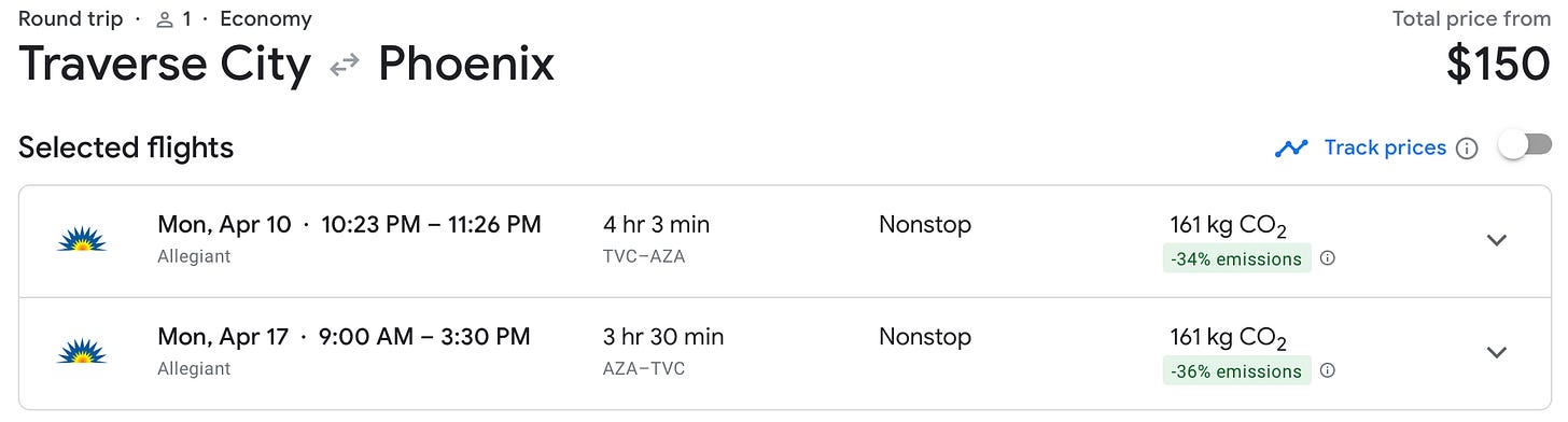 ✈️☀⛳️TC to Phoenix - Direct - April - $150rt!! ⛳️☀✈️I didn’t even know this flight existed, but this is a great price for a direct flight at the end of winter!Great Lakes Travel DealsNov 13, 2022ShareBook NowGreat Lakes Travel Deals is a reader-supported publication. To receive new posts and support my work, consider becoming a free or paid subscriber.Subscribe