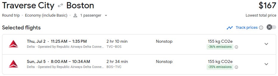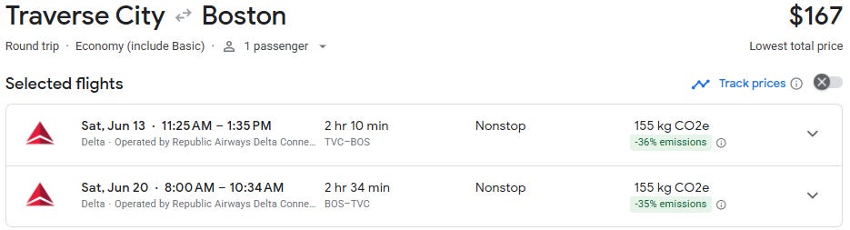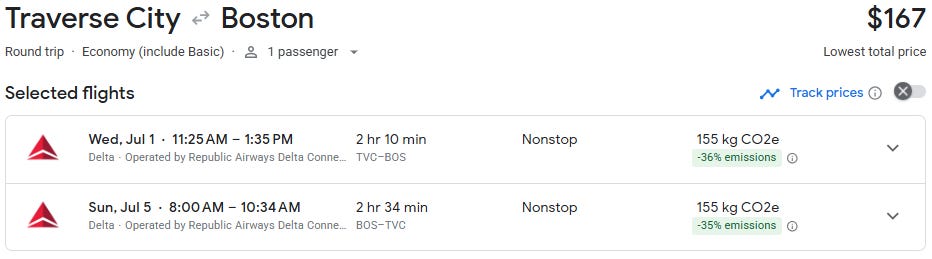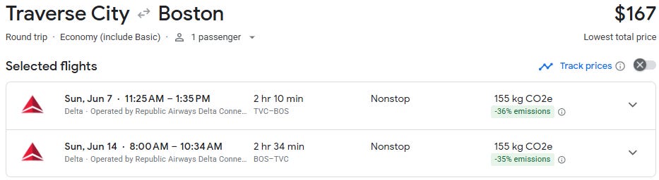 Discounted direct flights are starting to show up between Traverse City and Boston, with roundtrip fares around $167 for travel in June and July — well below the typical peak-season pricing on this route.