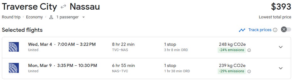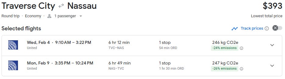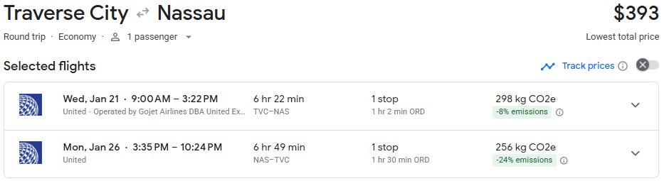 If you need a winter warm-up, United just delivered. Roundtrip flights from Traverse City to Nassau, Bahamas are pricing at $393 for travel January through March — a fantastic price for a route that has historically been $550+.