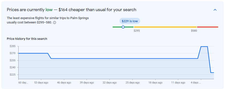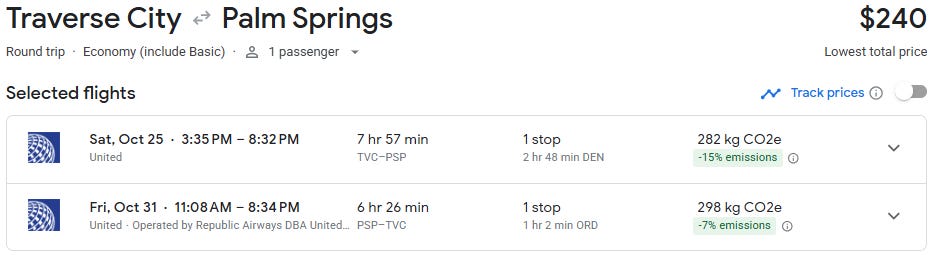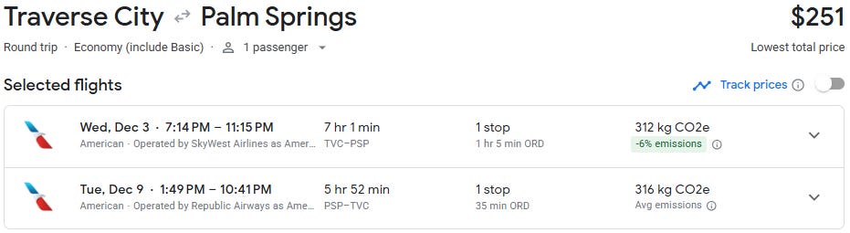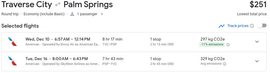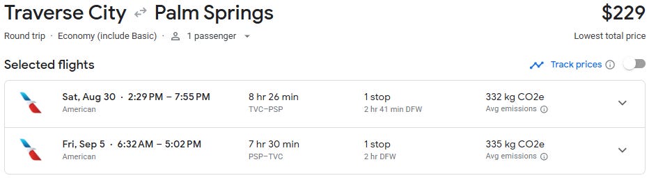 Here’s a fantastic warm-weather escape — flights from Traverse City to Palm Springs are now starting at just $229 round trip for travel September through January. This route normally runs $400 or more, so this is a big savings compared to the usual price.