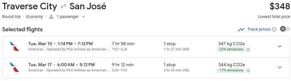 Flights from Traverse City to San José are starting at $348 for travel in late February and March, which is about as low as I’ve seen on this route. Prices haven’t been at this level since February 2024, making this a standout deal.