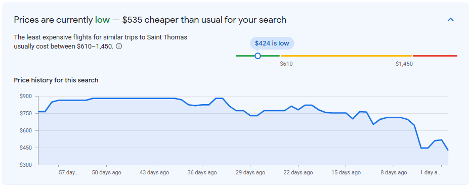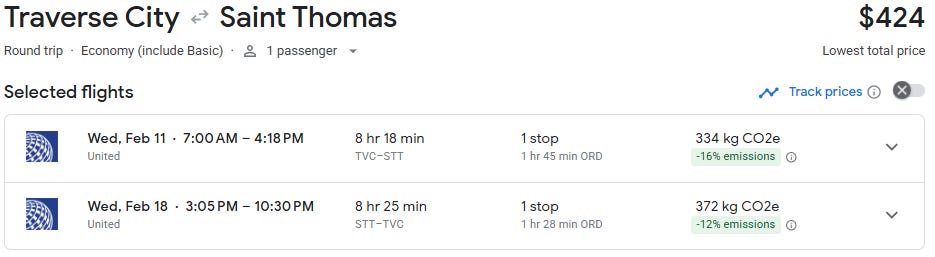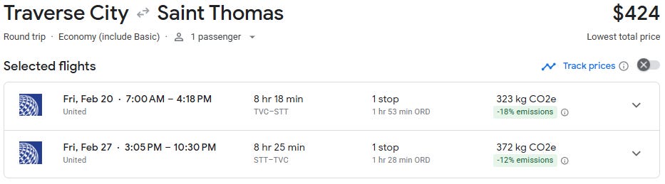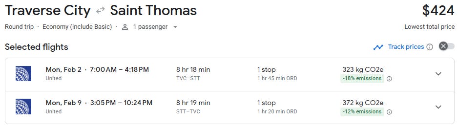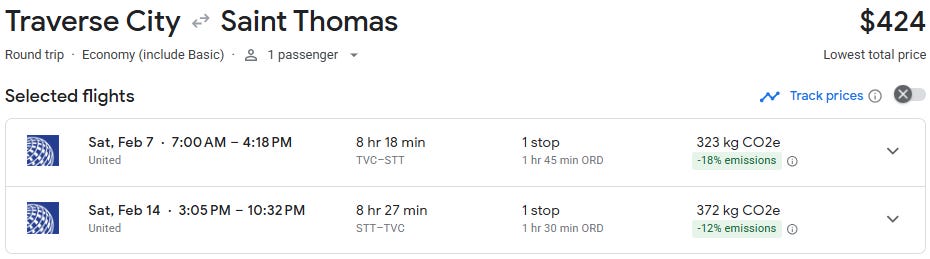 You can currently find roundtrip flights from Traverse City (TVC) to St. Thomas (STT) on United for $424 for travel in February.